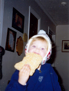 We also have extremely early bum lambs (orphan lambs), we started with four, and now we have two... but they're thriving, so it is all good. Well now it is about time to go make the bottles for the bummers and the mighty Thor (amazingly cute pygmy goat)! And here's a cute picture to boot, This is me when I was around four (?) at Grandma Sherie's house eating a huge "crispy treat" on my way to play in the snow!