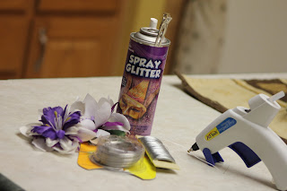 The picture below is the story of what I used to make the flower. I absolutely love hot glue guns, they are a girl's best friend. I also love glitter that comes in spray cans (I didn't know that it came in aresol form!!!).